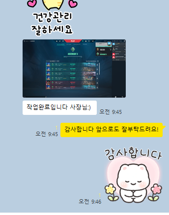 의뢰하신 작업이 완료된 후 필수적으로 완료 스크린샷을 발송하고 있습니다.